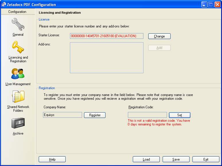 Step 3: Once you have received your registration code, start up the Zetadocs PDF configuration program, and enter the Licensing and Registration screen:
