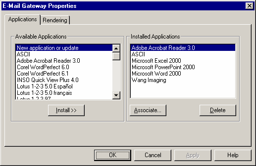 The Email Gateway Properties dialog provides two panels of settings: Applications and Rendering.