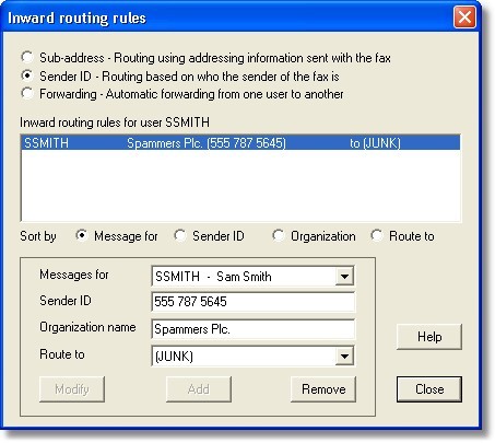 This dialog, like the others before, allows you to 'Add', 'Edit' or 'Delete' junk routing rules. To add a junk rule, simple populate the 'Message for', 'Sender ID', 'Organization name' and set the 'Route to' drop down to '(junk)' and then click the Add key. If the rule is invalid or already exists the 'Add' button will not become enabled. Similarly editing a rule simply select the rule from the list, edit the details and click the 'Modify' button. Again the 'Modify' button will not become enabled if the edited rule is invalid or already exists. To delete a rule, select the rule from the list and click the 'Remove' button.