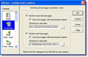 The archive files are created in the directories specified in the dialog - by default these are zfax \SERVER\Z-RECD for received faxes and zfax \SERVER\Z-SENT for sent faxes. A separate sub-directory is then created for each day, with a name of the form yymmdd ; for example, faxes received on the 1st October 2000 would be stored in the directory zfax \SERVER\Z-RECD\001001. Here zfax is the root Zetafax Server installation folder (e.g. C:\Program Files\Zetafax Server).