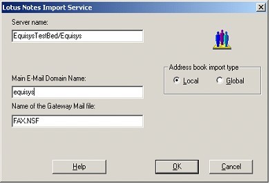 12.Click 'Yes'. When prompted with 'Lotus Notes Import Service' enter the server and E-Mail Domain names of the Domino server then click 'OK' as below: