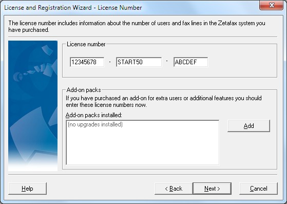 •Select the Add option to display Install add-on dialog. Enter your Zetafax Online add-on license number, then click OK to return to the Licensing and Registration Wizard.
