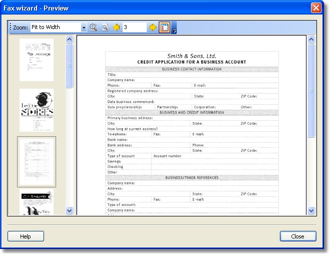 This view allows you to view each page of your fax that is rendered using the client. A thumbnail view is shown on the left hand side of the window, allowing you to navigate to any page within your fax: